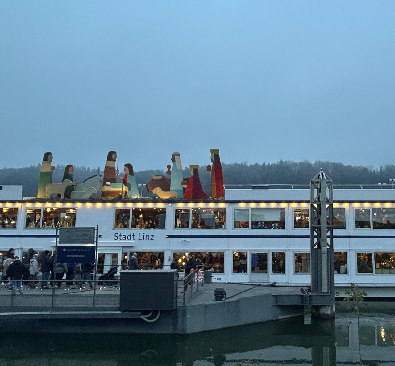 Beim (bewussten) Bummeln (siehe letzter Artikel) über den schwimmenden Markt vergisst man nie, dass man sich im Moment auf der Donau befindet, da man aus den Fenstern den Fluss sieht. Besonders im Dunkeln spiegeln sich die Lichter des Weihnachtsmarktes weihnachtlich im Wasser.